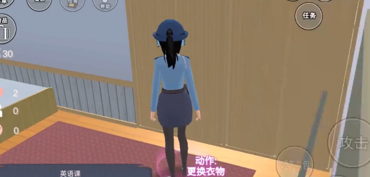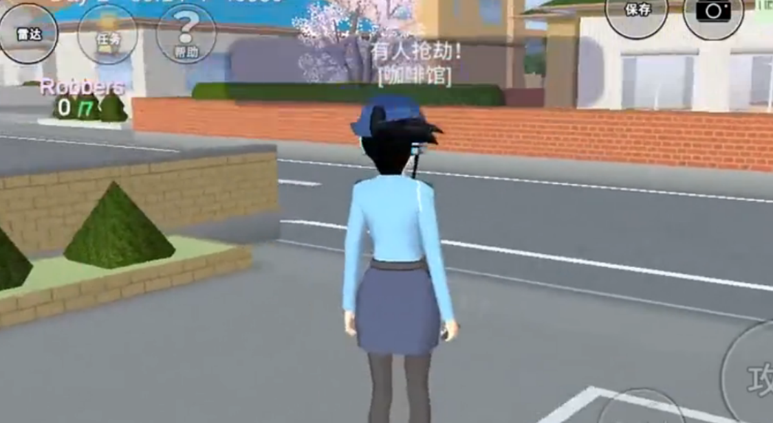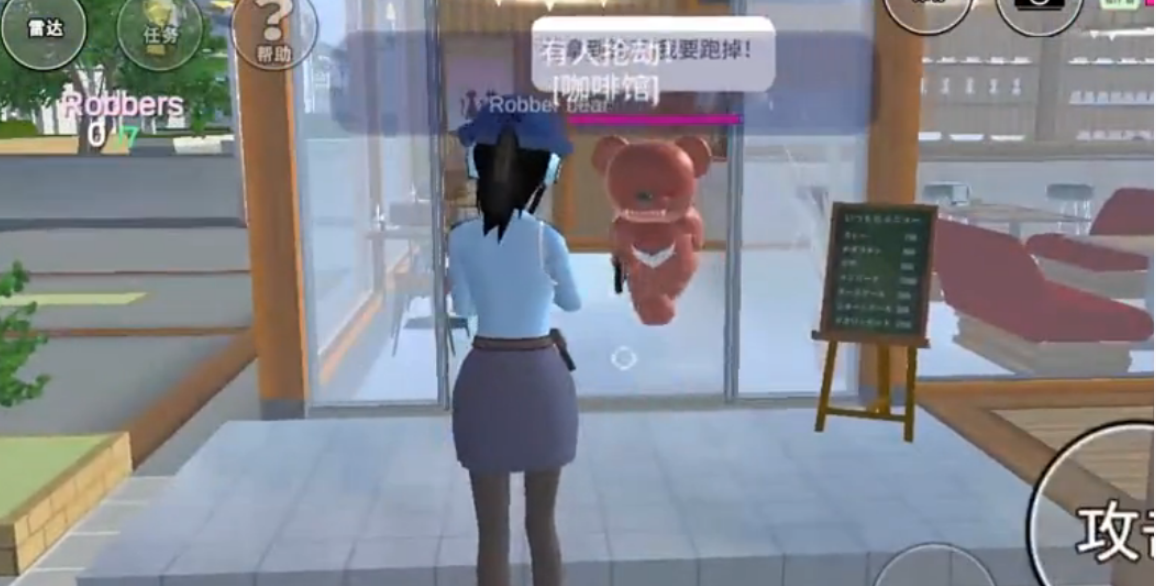1、在樱花校园模拟器中,玩家换上警服之后,过一会在右上角就会出现任务了,点开任务后会知道强盗熊在抢劫,打败他后就可以获得金钱;