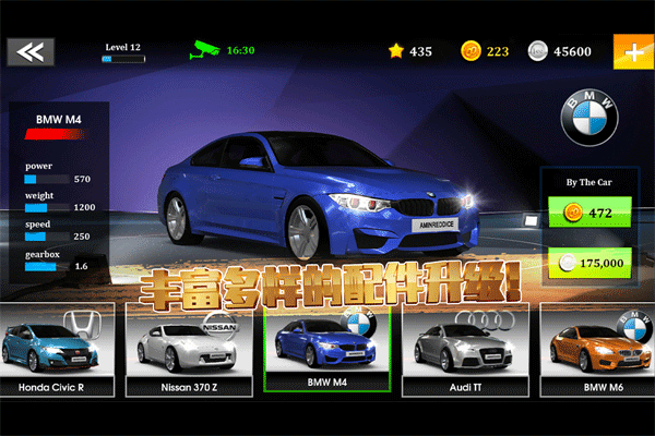 4、当你开车在练习阶段赢了的话,第一部需要选车,在展示厅中用硬币购买自己第一辆车到自己的车库里面。