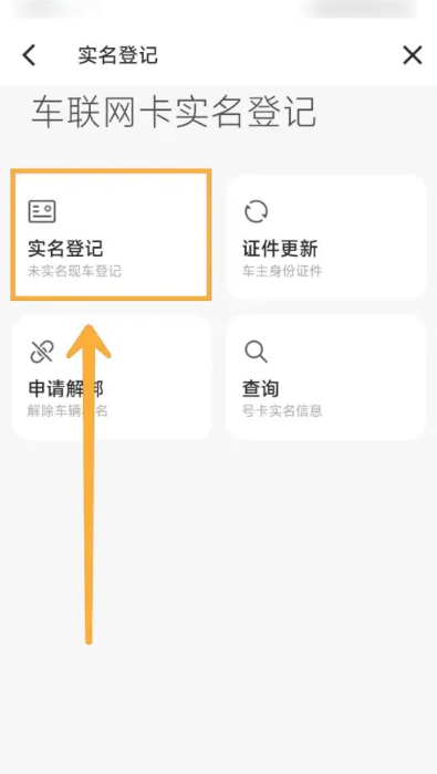 4、在车联网卡实名认证页面中,点击【实名登记】。