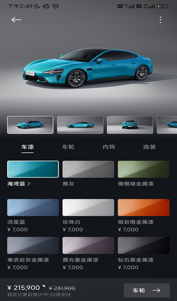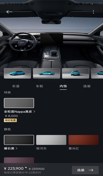 4、车漆、车轮、内饰、选装都能够进行选择。