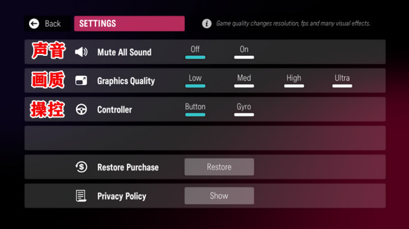2、现在还没有中文设置,只有声音、画质、操作几个选项,手机好的可以把画质拉满。