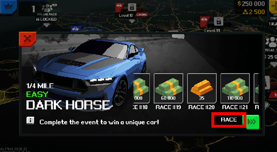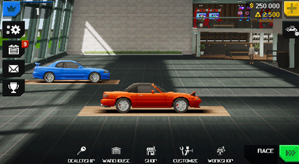 1、在游戏主页,可以选择给车辆改装,换色,购买新车等等,点击race即可开始赛车