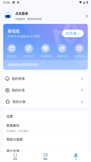 5、点击底部导航栏我,这里能看到你的表情,妙语和头像,设置里还能进行数据备份。