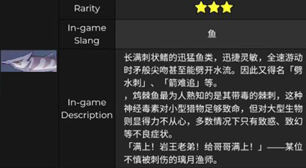 原神当中的鸠棘鱼是属于是棘鱼其中的一种,大家都知道棘鱼是一种破坏力十分强的鱼类,并且鸠棘鱼自身也是带有剧毒的这一点各位玩家小伙伴是要特别注意的,那么具体又都分布在什么位置呢,接下来小编就为大家带来《原神》鸠棘鱼分布位置介绍。