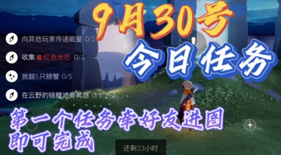 光遇的9月30日九月最后一天的日常任务中,需要各位玩家小伙伴将和别的玩家互相传递能量、收集红色光芒、掀翻五只螃蟹、云野在锦鲤中冥想,那么这些日常任务中大家具体该怎么去操作呢,下面71游戏网小编就为大家带来《光遇》9月30日常任务完成攻略分享