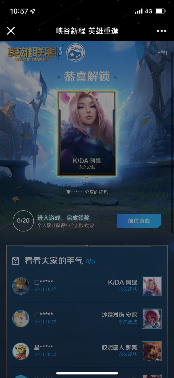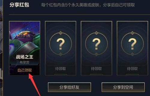 4、当我们分享完成之后,就会发现在每个红包中都包含着5个英雄和皮肤分享后即可领取。