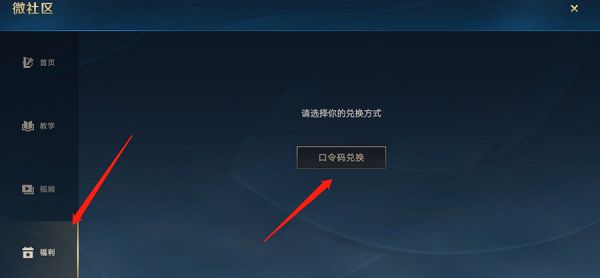 2、在微社区界面中点击一下左下角的福利按钮,弹出窗口点击兑换码按钮。