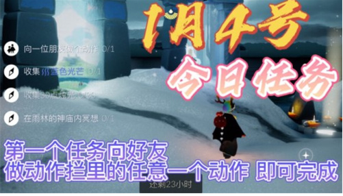 在光遇游戏中每天都会有日常任务需要我们去完成,在完成任务之后就可以获得相应的奖励,每天都会有四个任务需要我们去完成,今天的任务有向好友鞠躬、在霞谷追逐蓝光、收集一些点亮的蜡烛、前往雨林冥想,那么想知道1月4日常任务完成攻略的就跟随小编一起来看看吧。