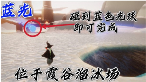 2、我们来到霞谷地图的滑冰场,站在山上可以看到冰面会出现蓝色光芒,需要靠近触摸任务就可以完成。