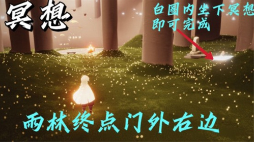 4、我们直接前往雨林地图的终点,门外右侧的树林中可以看到冥想点,进入白圈内打坐就可以完成任务。