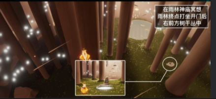 4、「在雨林神庙冥想」在雨林神庙打坐开门后右前方树干从中的石碑前光圈处打坐并留言。