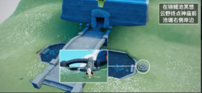 4、「在锦鲤池冥想」在云野神庙门口池塘右岸边的石碑前光圈处打坐并留言。