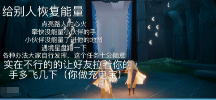 1、「向其它玩家传递能量」给快没能量的玩家回复能量(大叫,牵手,点蜡烛),和好友手拉手进一个地图,去云野点亮一个无翼,实在不行的的让好友拉着你的手飞几下(你做充电宝)就行了。;