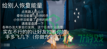 1、「向其它玩家传递能量」给快没能量的玩家回复能量(大叫,牵手,点蜡烛),和好友手拉手进一个地图,去云野点亮一个无翼,实在不行的的让好友拉着你的手飞几下(你做充电宝)就行了;