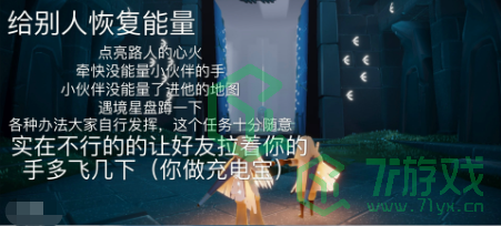 1、「向其它玩家传递能量」给快没能量的玩家回复能量(大叫,牵手,点蜡烛),和好友手拉手进一个地图,去云野点亮一个无翼,实在不行的的让好友拉着你的手飞几下(你做充电宝)就行了。;