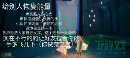 1、向其它玩家传递能量」给快没能量的玩家回复能量(大叫,牵手,点蜡烛),和好友手拉手进一个地图,去云野点亮一个无翼,实在不行的的让好友拉着你的手飞几下(你做充电宝)就行了;