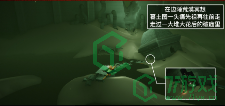 4、「在边陲荒漠冥想」在暮土图一一大堆花前面的破庙内的石碑前光圈处打坐并留言。