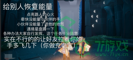 1、「向其它玩家传递能量」给快没能量的玩家回复能量(大叫,牵手,点蜡烛),和好友手拉手进一个地图,去云野点亮一个无翼,实在不行的的让好友拉着你的手飞几下(你做充电宝)就行了;