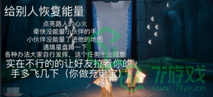1、「向其它玩家传递能量」给快没能量的玩家回复能量(大叫,牵手,点蜡烛),和好友手拉手进一个地图,去云野点亮一个无翼,实在不行的的让好友拉着你的手飞几下(你做充电宝)就行了;