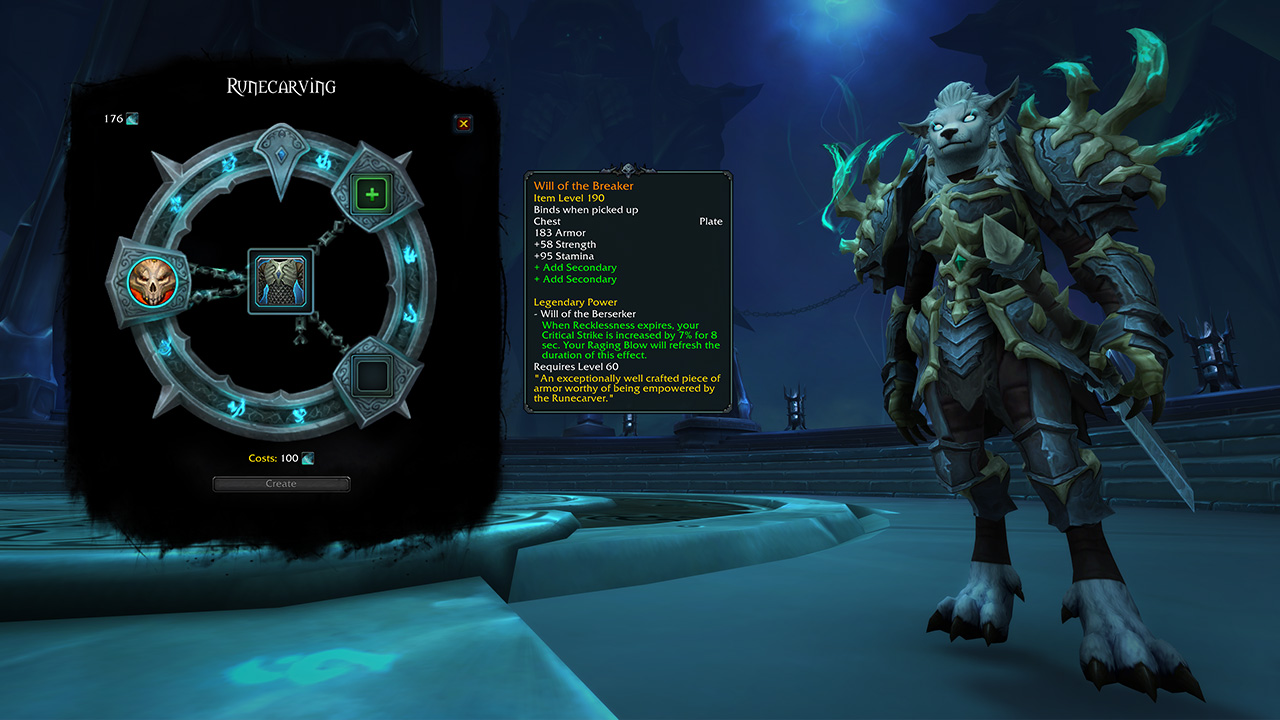 制造传说装备需要使用多种组件:一件“暗影国度”制造的传说基础物品,两个公函、灵魂灰烬,以及一个刻符者的记忆。基础物品和公函可以通过专业技能制造,在托加斯特中攀登楼层便可获得灵魂灰烬,而刻符者的记忆配方可以通过“暗影国度”的许多内容解锁。