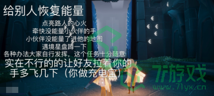 1、「向其它玩家传递能量」给快没能量的玩家回复能量(大叫,牵手,点蜡烛),和好友手拉手进一个地图,去云野点亮一个无翼,实在不行的的让好友拉着你的手飞几下(你做充电宝)就行了;
