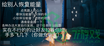 1、「向其它玩家传递能量」给快没能量的玩家回复能量(大叫,牵手,点蜡烛),和好友手拉手进一个地图,去云野点亮一个无翼,实在不行的的让好友拉着你的手飞几下(你做充电宝)就行了;