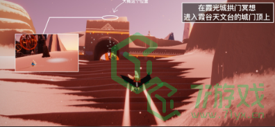 4、「在霞光城拱门冥想」在进入霞光城地图后,霞光城主体建筑入口城门上方的石碑前光圈处打坐并留言。