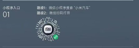 1、可通过微信小程序【小米汽车】,或扫码打开小米汽车小程序。