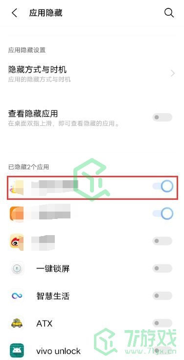 4、对想要隐藏的应用,点击后方功能开启图标就可以开启隐藏。